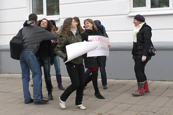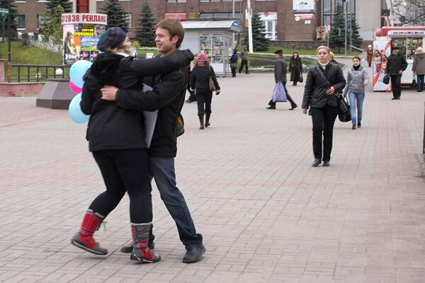 Каля дзясятка вабных маладых дзяўчат з рознакаляровымі паветранымі шарыкамі і самаробнымі плакацікамі, ня якіх па-беларуску і па-англійску было напісана “Вольныя абдымкі”, па ўсім было відаць, узнялі настрой многім мінакам. У абдымкі прыгажуні заключалі ўсіх, хто трапляўся па дарозе: і хлапцоў, і дзядуль, і бабуль, і маладзенькіх дзяўчатак разам з іхнімі кавалерамі, і мужчыну-інваліда. Амаль усе людзі ўсміхаліся і неспадзяваным абдымашкам на вуліцы не працівіліся.