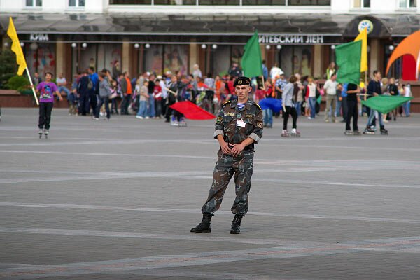 Нагадаем, што ў мінулую сераду на плошчы Перамогі праводзілася рэпетыцыя Дня горада. У 18:00 гэтая плошча была ачэпленая міліцыяй і на ёй з’явілася група моладзі на роліках са сцягамі ўсіх колераў вясёлкі. Яны хаатычна качаліся па пляцу, час ад часу ганяючыся адзін за адным.