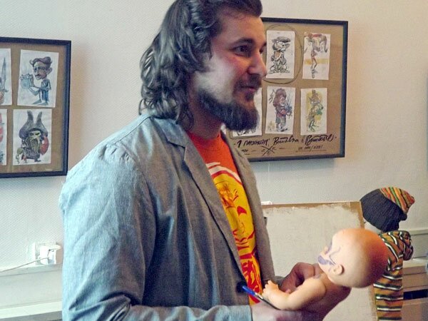Художник пришел на вернисаж в стильном светло-сером пиджаке и оранжево-желтой майке, похоже, собственного дизайна. Мило улыбаясь, сначала он разрисовывал шариковой ручкой куклу-голыша. Во время презентации застенчиво молчал, время от времени лишь предлагая зрителям: «Шнапс». И показывал на столик, уставленный желтыми и розовыми стаканчиками с шампанским. А потом сел за мольберт – и скоро все увидели нечто похожее на голову пупса с красной коммунистической звездой во весь глаз.