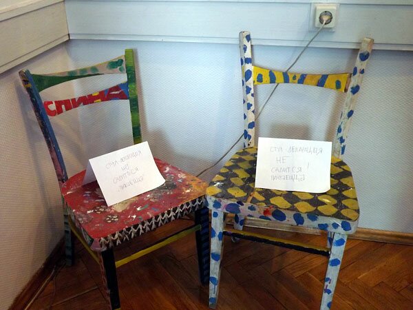 «Худграфовская» молодежь восторженно молчала. Немыми свидетелями происходящего были также стулья-декорации. На них находились бумажные таблички с предупреждением: «Не садится! Пачкаецца» (орфография сохранена). Сиденье одного стула было раскрашено под шахматную доску. Второй стул был расписан в цветочки и человечки. На его спинке так и сообщалось: «Спина».