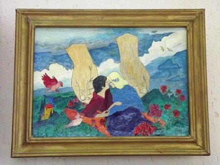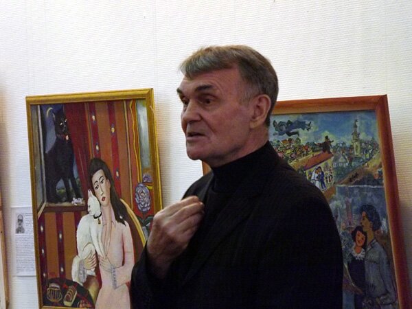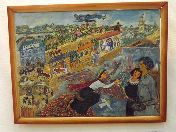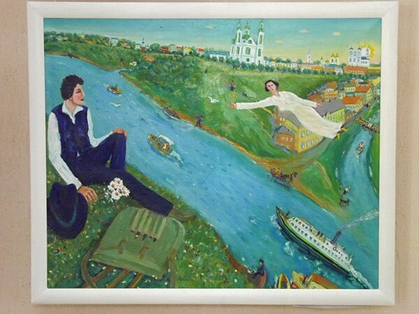 «ННВ»: стиль Шагала сложен и одновременно по-детски прост. А у ребенка безграничная фантазия. Наверное, поэтому художник-самоучка из поселка Ветрино Полоцкого района, бывший железнодорожник Николай Никитинко перенес шагаловских героев – музыкантов и влюбленных, из Витебска в Полоцк. И вот летят-плывут его жених и невеста в лодке над Спасо-Ефросиньевским монастырем. Жених гребет по воздуху веслами. А невеста бросает жителям города цветы… Руки Бога обнимают влюблённых на картине художницы Галины Канциял. Ну и как же без шагаловских коров, козлов и петухов? На выставке в ВОМЦНТ зритель увидит наивные «портреты» этих животных и птиц.