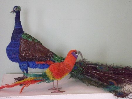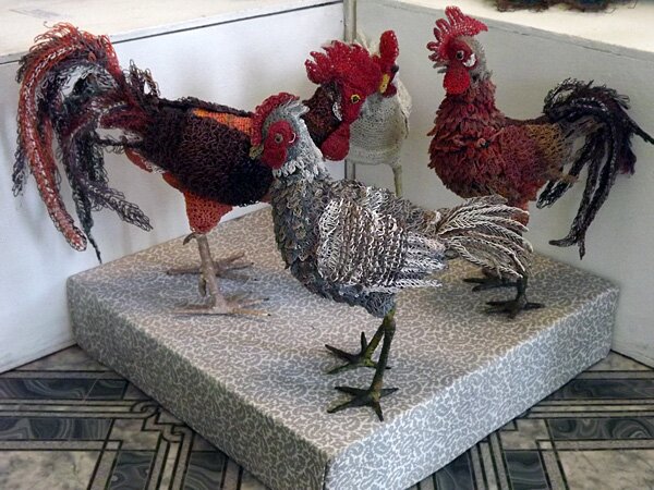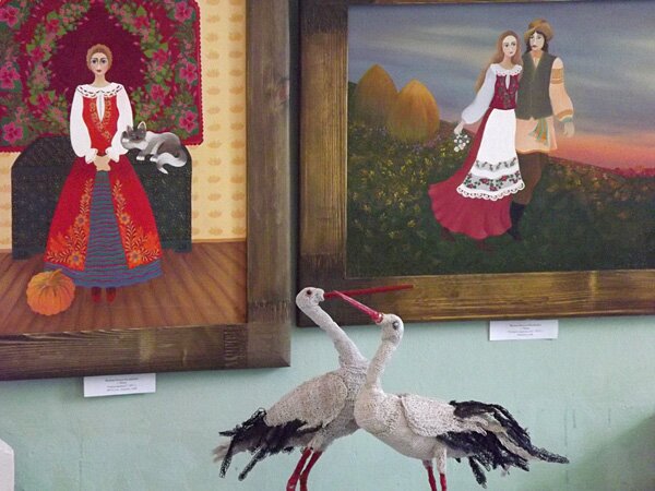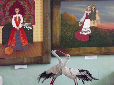 «ННВ»: Когда от милых цветочков, котиков, бабочек в незатейливой манере уже стало пестреть в глазах, я внезапно попала в настоящий… птичник! Попугаи, павлины, аисты, куры и какие-то неизвестные райские птицы «присели» отдохнуть прямо посреди музейного зала. А «прилетели» они к нам из Мостов Гродненской области. Тамошний мастер Лилия Макаревич плетет их из цветной проволоки! Вообще этот регион представлен на выставке довольно яркими мастерами. Художественная вышивка Алевтины Ковалевской из Гродно добавляет проекту жанрового разнообразия и тепла. Впечатлили колоритные картины минчанки Ольги Яресько (известна под творческим псевдонимом Пани).