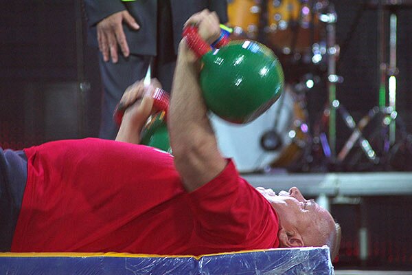Ежов – уроженец Витебска. Но сейчас живет в Архангельске, руководит там институтом. В родной город он специально приехал, чтобы «сделать» тут предыдущего рекордсмена в номинации «жим лежа двух гирь по 22 кг попеременно в течение 1 минуты». Для этого ему было нужно за этот отрезок времени поднять гири как минимум 140 раз (3080 кг). Ежов сделал это больше – 147 раз! Это составило 3234 кг.