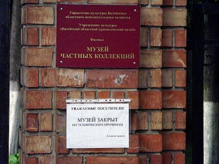 Музей частных коллекций в Витебске закрыт. Возле ворот у входа на территорию этого учреждения культуры висит объявление, которое сообщает, что музей закрыт по техническим причинам. Но это для отвода глаз посетителей и гостей города, которые приходят сюда во время “Славянского базара”. На самом деле музея больше нет.