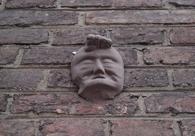 Возле одного из окон бывшего купеческого дома отвалилась половина колонны. И некоторые витебские шутники любят фотографироваться, становясь возле стены и «поддерживая» головой отбитую часть.