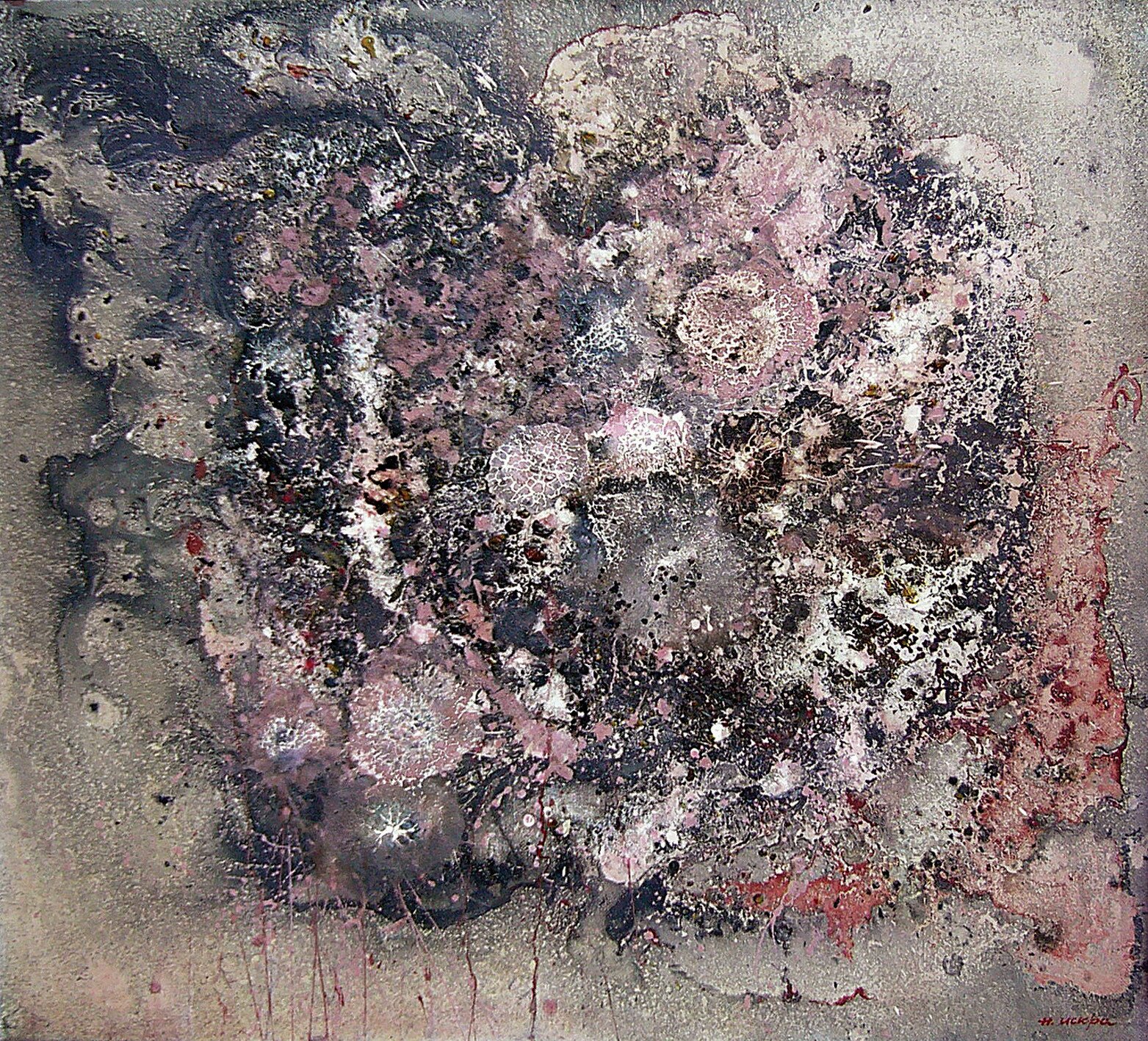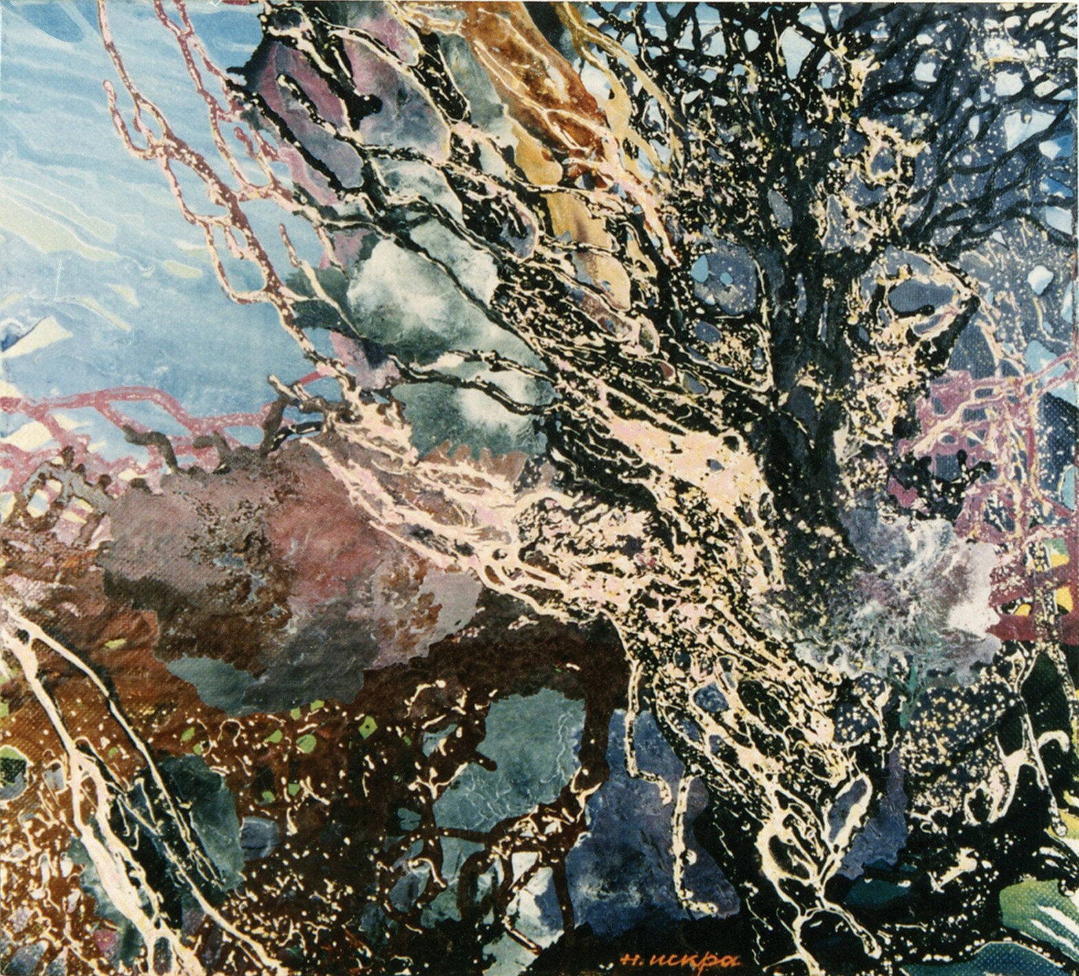 «Ночное притяжение луны». Картина экспонировалась на знаменитой выставке на Малой Грузинской в Москве в 1998 году. Николай Искра всегда был экспериментатором, и здесь применил необычный для тех лет приём. В результате получилась очень интересная и загадочная работа, которая часто экспонировалась в России.