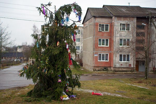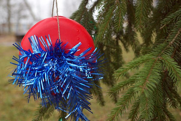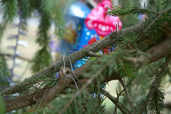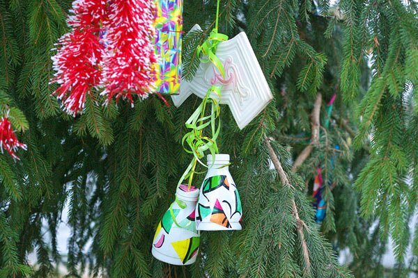 Не увидите вы на ёлочке шариков цветных, розовых пряников и шишек золотых. В основном украшения сделаны из пустых пластиковых бутылок и тому подобных бытовых отходов, завернутых в фольгу и цветную бумагу.