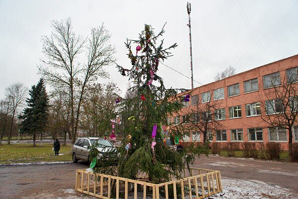 Вид ёлочки у дома №13 на 1-й Шумилинской улице заставляет усомниться, что она много, много радости детишкам принесла. Несчастное деревцо лишили вершины, которая, возможно, украсила чье-то жилище. Эрзац-вершину соорудили из еловой ветки, привязанной к стволу проволокой, но она вскорости поникла. Неизвестный дизайнер пытался увеличить пушистость, также привязывая проволокой к редким веткам дополнительные ветки и притягивая их к стволу шпагатом. Увы, вся эта хитрая конструкция скособочилась и имеет явно не праздничный вид.