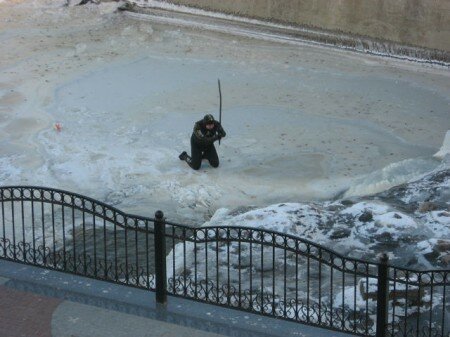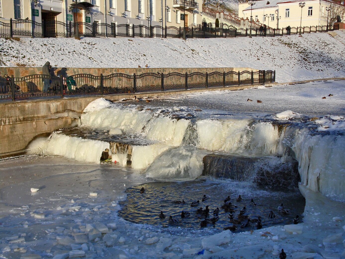 Гениальное решение вопроса и главное безопасно. Обычно, чтобы не замерзало место для водоплавающих птиц, организуют фонтан и подают подогретую воду. Ну да в Витебске по-своему, но не эффективно, т.ч. тупо ждём оттепели с утками 🙂