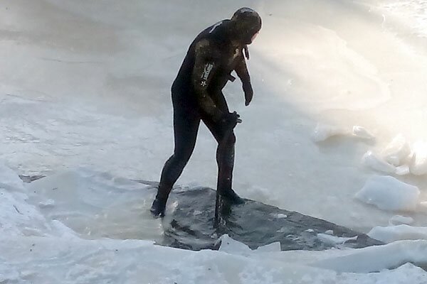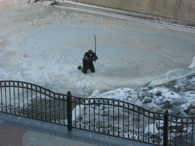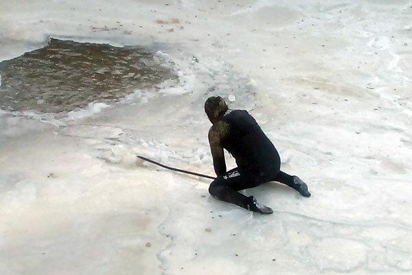 На фото видно, как парень, стоя на коленях, ломом отбивает куски льда, расширяя замерзший водоем. Кто это, работник служб или просто любитель природы, сказать сложно. Но, скорее всего, последняя версия более реальна. Видно, что парню было нелегко физически: отбитые льдины 10-сантиметровой толщины лежат по всему периметру лунки.