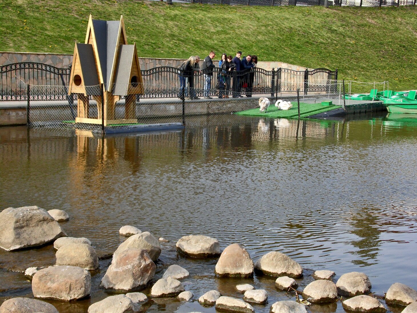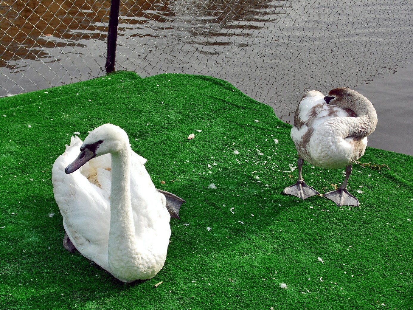 Домик на реке и часть причала, который напоминает зеленый искусственный газон, огородили металлической сеткой, чтобы обезопасить постояльцев. Сами же лебеди не демонстрируют никакого желания покинуть свое уютное убежище.