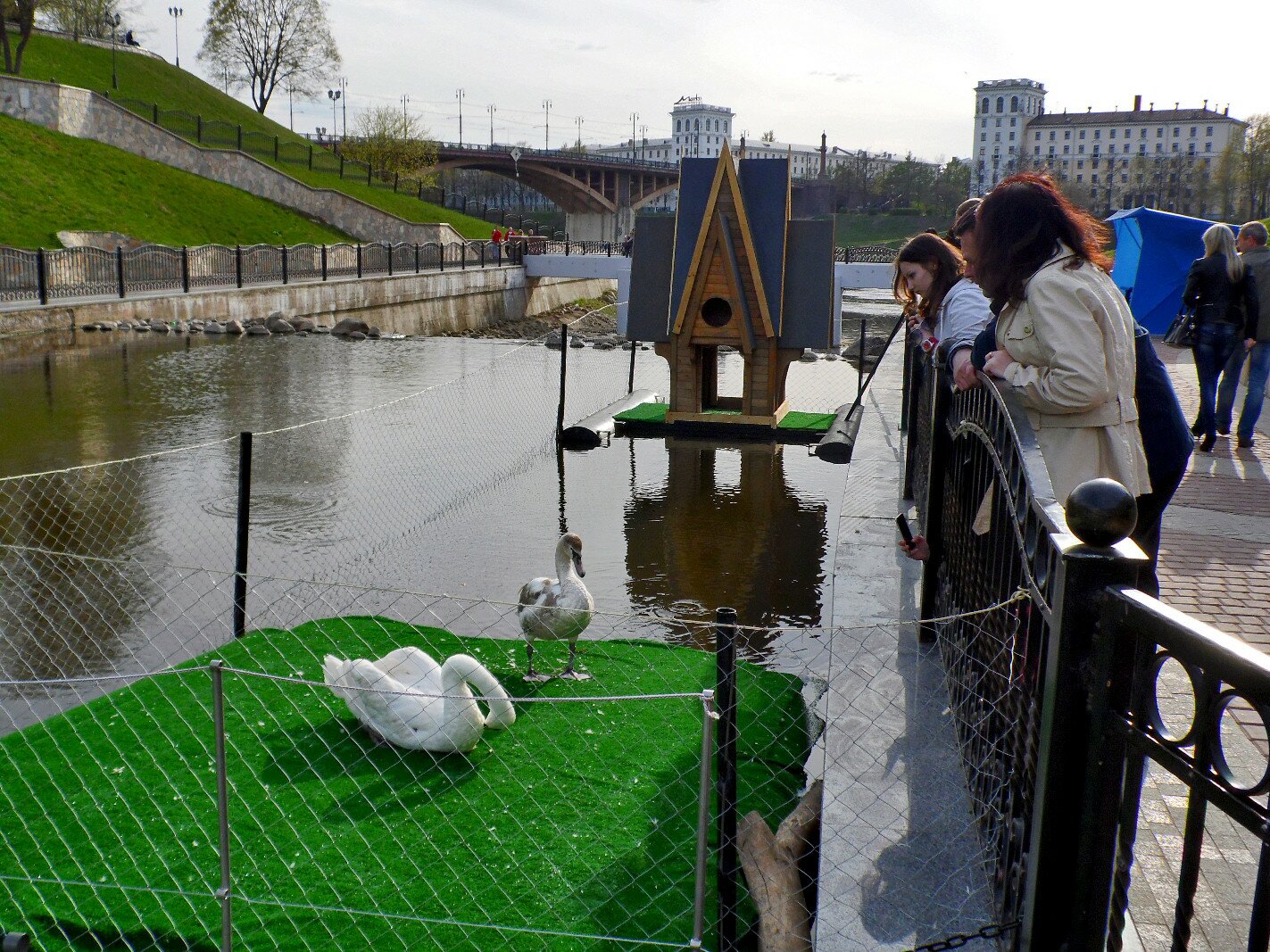 Оказалось, что в деревянном тереме, недавно установленном в устье Витьбы, будут жить два лебедя. Пара белоснежных птиц совсем не боится людей и с удовольствием позирует перед фотоаппаратами.