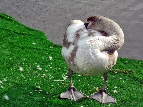Перекусив из миски в углу вольера, грациозная пара начала приводить себя в порядок, пощипывая пух и поправляя перья. Затем одна из птиц решила вздремнуть, засунув голову между крыльев.