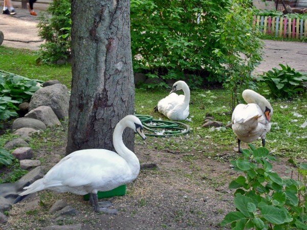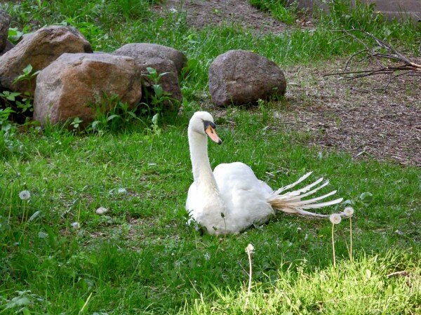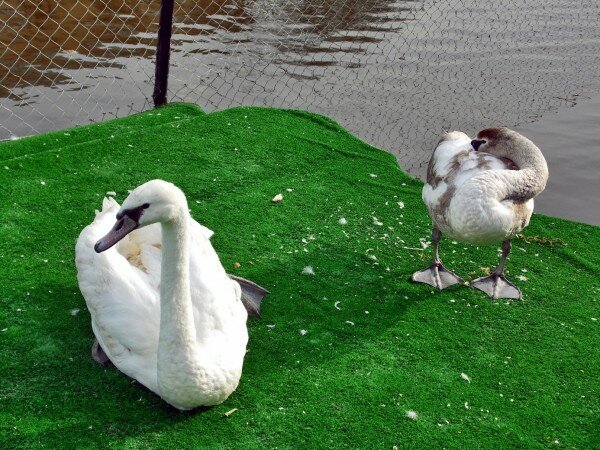 В понедельник с семьей там гуляли. Было два лебедя. И у одного что-то было не так с лапкой. Он странно ее держал на спине под крылом.