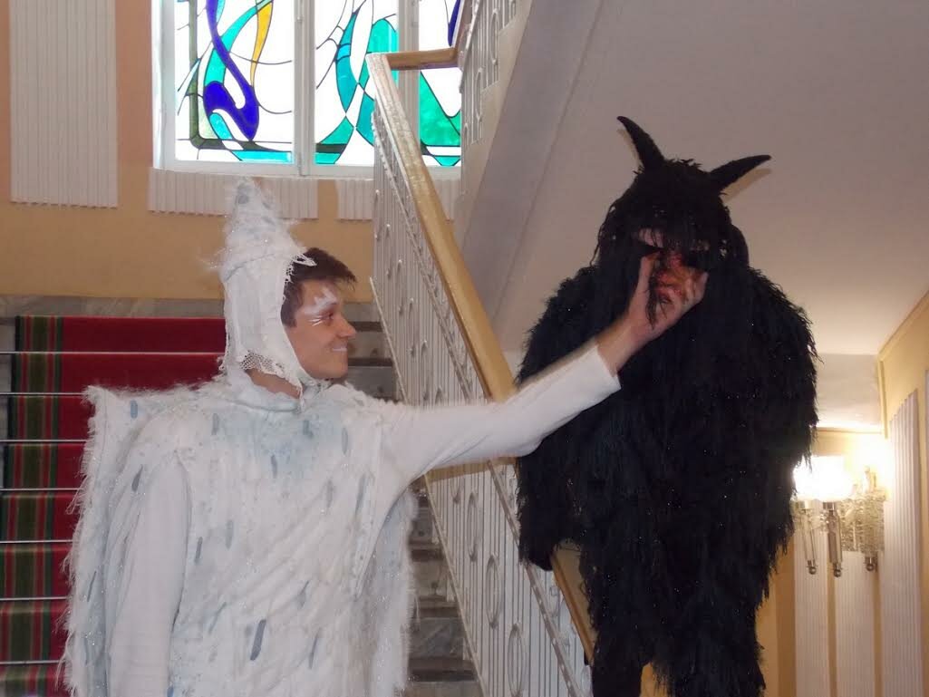 Перед тем, как посетители поднялись по лестнице в зрительный зал, им пришлось увидеть развернувшуюся мистерию борьбы ангела и представителя «нечистой силы» за их души. В результате, несмотря на так и неизжитые противоречия, оба сошлись на том, что поздравить юбиляра – дело самое, что есть благородное, и пригласили всех принять участие в праздновании.