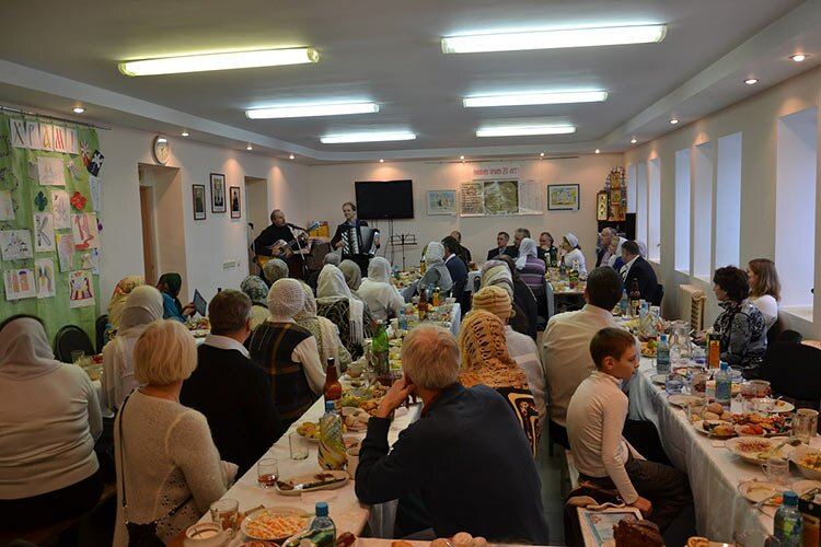 После литургии торжество плавно перенеслось в воскресную школу, где уже были накрыты праздничные столы. Владыка Димитрий поздравил настоятеля и прихожан с праздничным юбилеем. Молодежный хор спел несколько песен. Младшие ребята воскресной школы рассказали замечательные стихи. Трио «Ковчег» наполнило класс душевными песнями. Особенно трогательным моментом был просмотр фильма о приходе, сделанный инициативной группой прихожан: Ларисой Мартыновой, Светланой Середенко, Яном Говороцовым и многими другими.