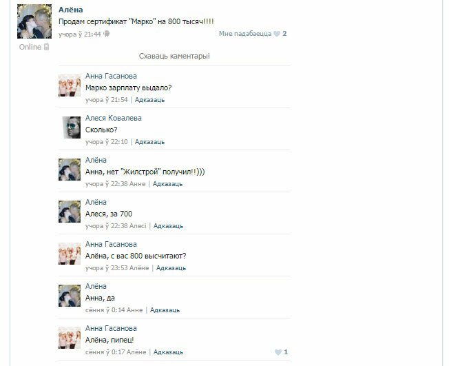 В социальных сетях под объявлениями о продаже таких сертификатов витебляне шутят, что, вероятно, таким образом «Марко» рассчиталось с «Жилстроем» за строительство нового логистического центра «OUTLET Marko».