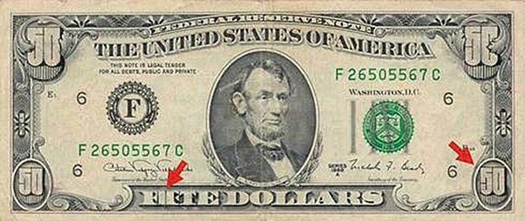 Кассир сразу обратила внимание на странную купюру: ведь она была изготовлена из пятидолларовой купюры путем наклейки числа «50» и надписи «FIFTY DOLLARS». В тоже время на купюре оставался портрет Линкольна вместо необходимого Гранта.