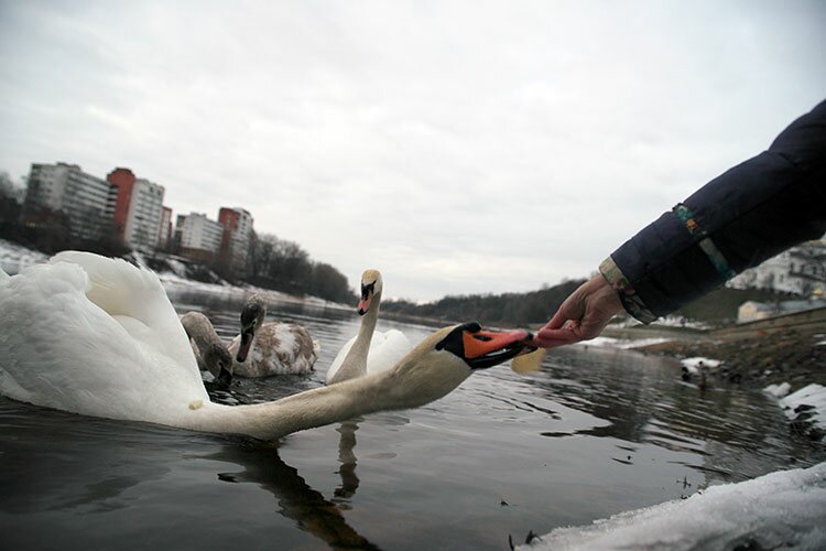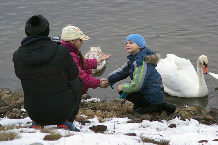 Птицы были разбиты на две группы: пара взрослых лебедей с двумя молодыми, не успевшими сменить серое оперение на белое, и еще одна взрослая пара. Вероятно, лебеди зимовали де-то в Беларуси на незамерзающем водоеме. Птицы не боятся людей и берут угощение прямо с рук.
