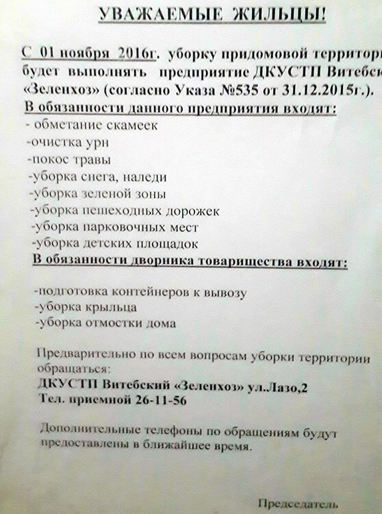 Перераспределение обязанностей дворников можно примерно оценить по объявлению, опубликованному на семейном форуме Витебска: согласно документу за дворниками товарищества остаются только уборка крыльца и отмостков дома, а также подготовка мусорных контейнеров к вывозу.