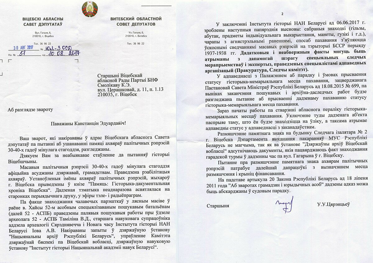 В своем ответе председатель облсовета подчеркивает, что массовые репрессии времен сталинизма официально осуждены белорусским государством, а также обществом. В тоже время он сообщает вопрос о установке памятного знака жертвам этих репрессий требует доработки в плане определения места размещения и источников финансирования.