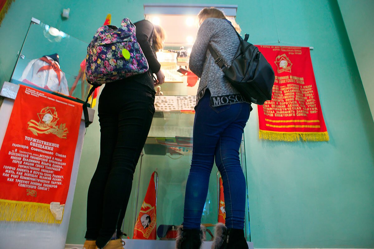 Отдельные стенды прекрасно показывают, как в СССР культ Ленина прививался детям с первых классов школы. Один из них посвящен символике октябрятского движения, второй пионерской организации — и там, и там портреты лучшего друга всех детей Владимира Ильича. Следует отметить, что портрет Ленина на пионерском значке появился только в 1962 году, когда Всесоюзная пионерская организация была награждена орденом Ленина.