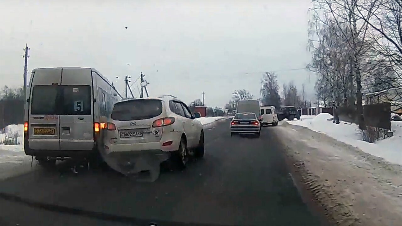 ДТП произошло около 11:00: сначала микроавтобус, ехавший по маршруту №5 Полоцк-Новополоцк, за рулем которого был 47-летний водитель, столкнулся пи обгоне с поворачивавшим налево кроссовером «Hyundai», затем маршрутку вынесло на обочину, где она врезалась в стоявшую «Волгу». После двух столкновений микроавтобус вылетел в кювет.
