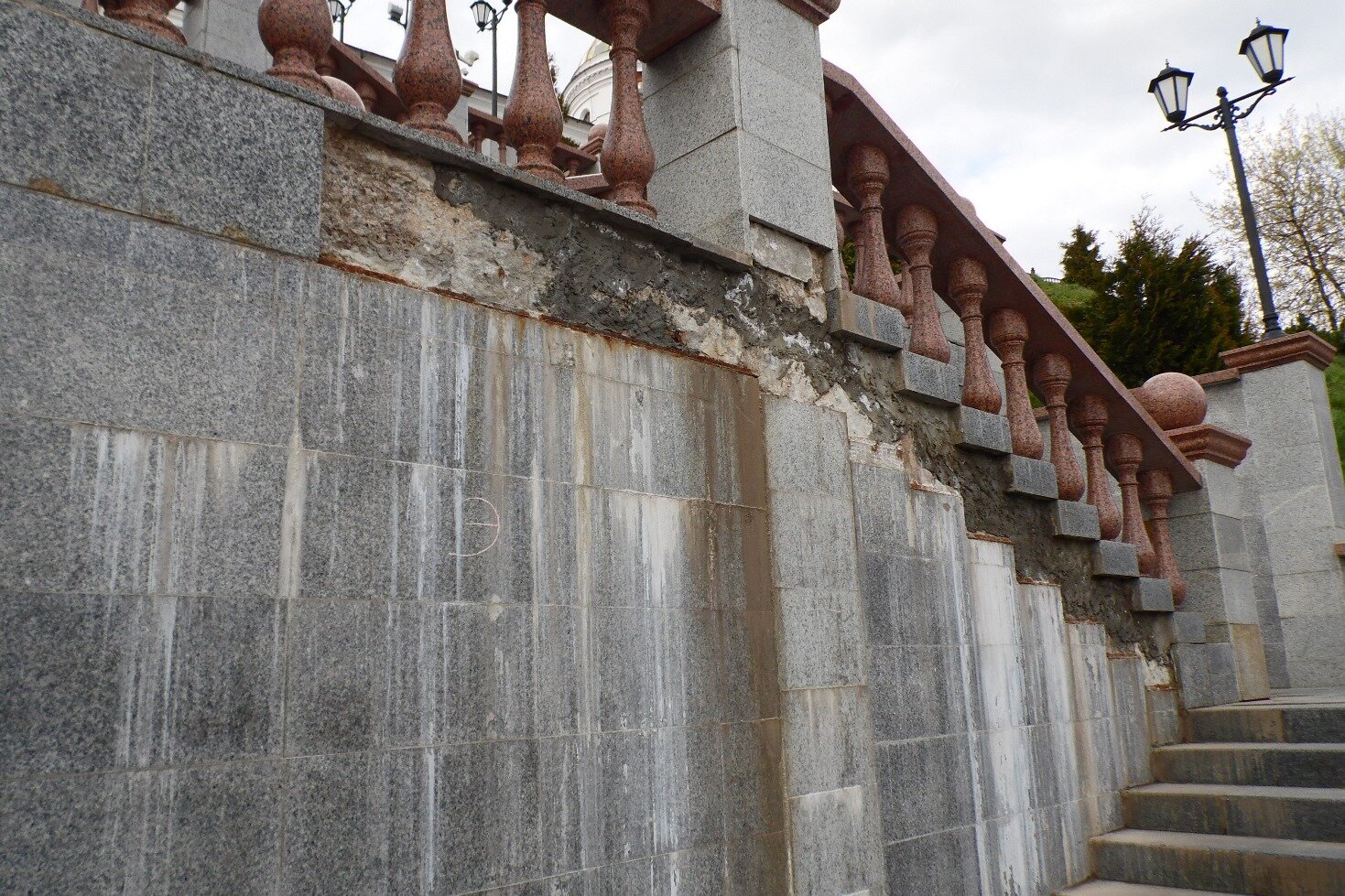 Также, как обычно весной, дала трещины штукатурка на опорной стене балюстрады лестницы. Скорее всего, ее опять придется полностью снять, чтобы избежать падения увесистых пластов на головы туристов и припаркованные автомобили владельцев ближайших заведений общепита.