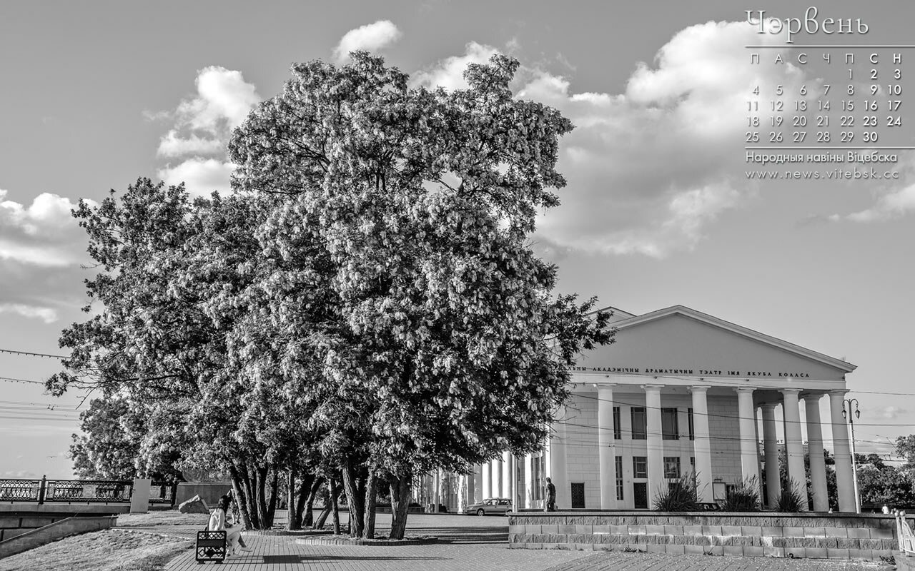Кампутарныя шпалеры на працоўны стол з фота пейзажаў Віцебска і календаром на чэрвень 2018 года для чытачоў "ННВ": квітнеючая акацыя на плошчы 1000-годдзя ля тэатра імя Якуба Коласа.