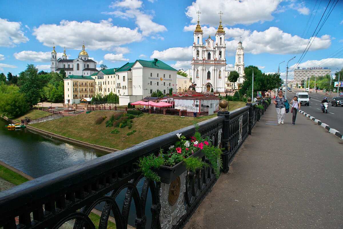Композиции из красных и белых петуний в цветниках, какие мы привыкли видеть на балконах, закрепили на перилах Октябрьского моста, по которому улица Ленина пересекает Витьбу.