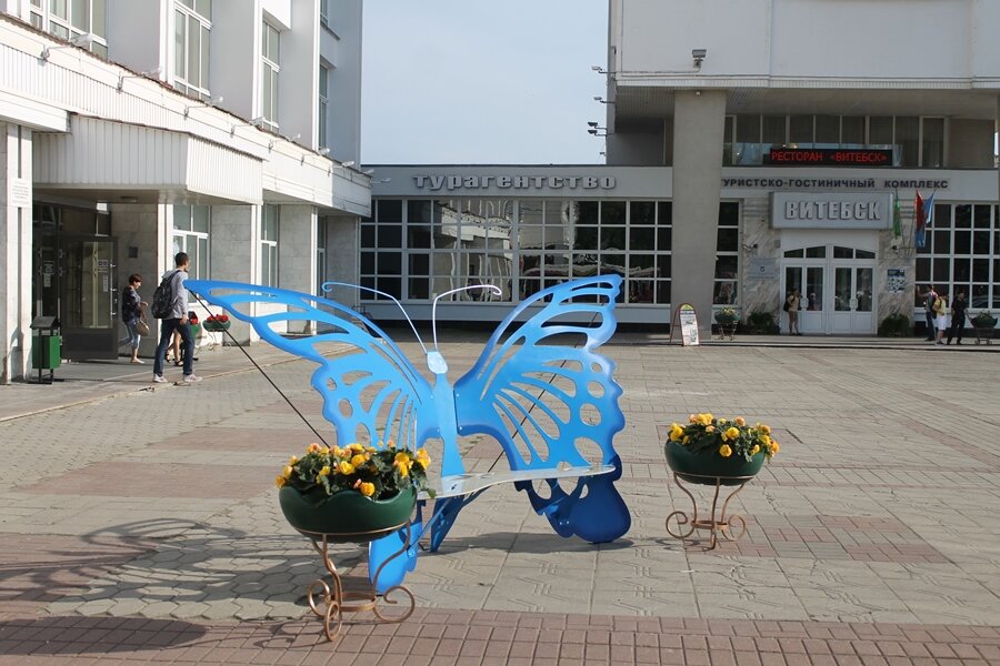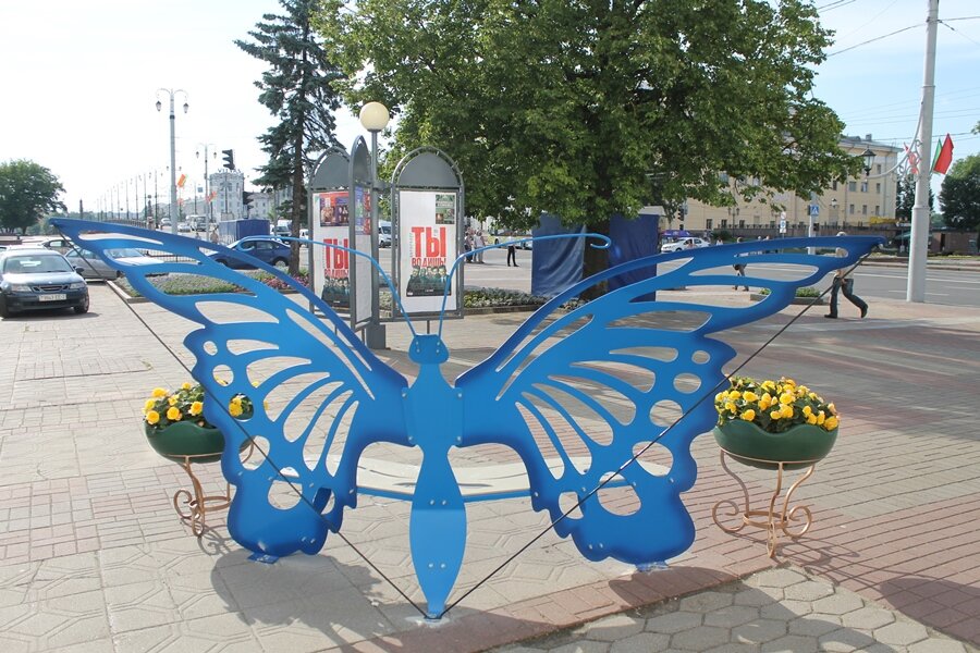 В Витебске возле универмага установили бабочку-скамейку. Малые архитектурные формы все прибывают и прибывают