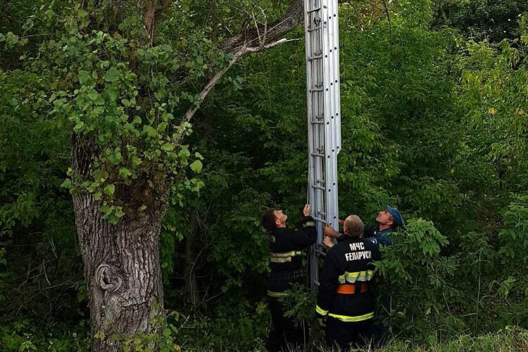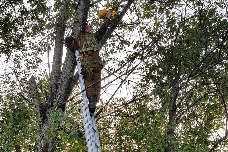 С помощью трехколенной складной лестницы спасатели смогли забраться на высокое дерево и снять оттуда пакет. Оказалось, что в нем находятся четверо еще слепых щенят.
