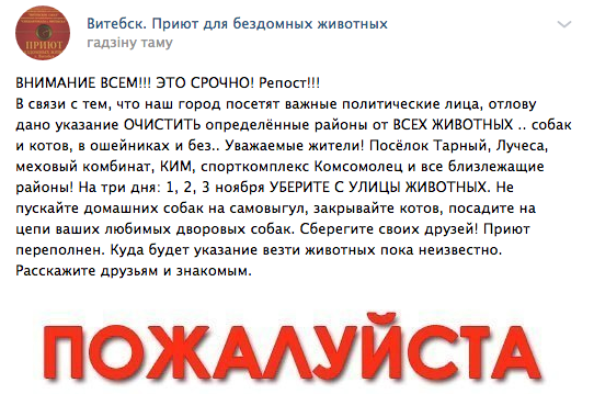 При этом отмечается, что витебский приют для животных переполнен. Куда будут свозить отловленных отловленных животных пока неизвестно. Волонтеры просят поделиться этой информацией с друзьями и знакомыми.