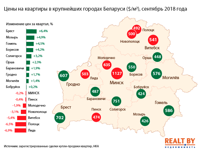За «квадрат» витебской квартиры в сентябре текущего года платили в среднем $541, что на 5,4% ниже, чем кварталом ранее. В Новополоцке цена проданных квартир составляла в среднем $500 за м2 (-3,1%). Еще заметнее квартиры подешевели в Полоцке — минус 6,5% за квартал (492 $/м2). Такие темпы снижения цен одни из самых существенных среди крупных городов Беларуси.