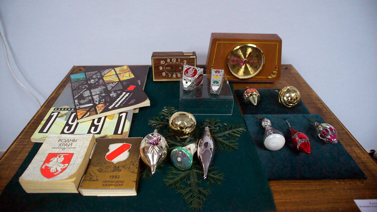 Кроме собственно елочных украшений в экспозицию включены различные вещи из фондов ВОКМ, так или иначе связанные с новым годом. Кроме часов, которым положено показывать «двенадцать без пяти», выставлены и календари. Причем можно увидеть как советский календарь 1938 года, так и первые календари независимой Беларуси.