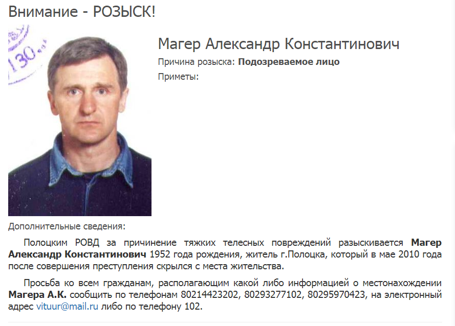 Судя по информации правоохранительных органов, задержан ранее неоднократно судимый житель Полоцка Александр Магер, который скрылся от уголовного преследования в мае 2010 года.