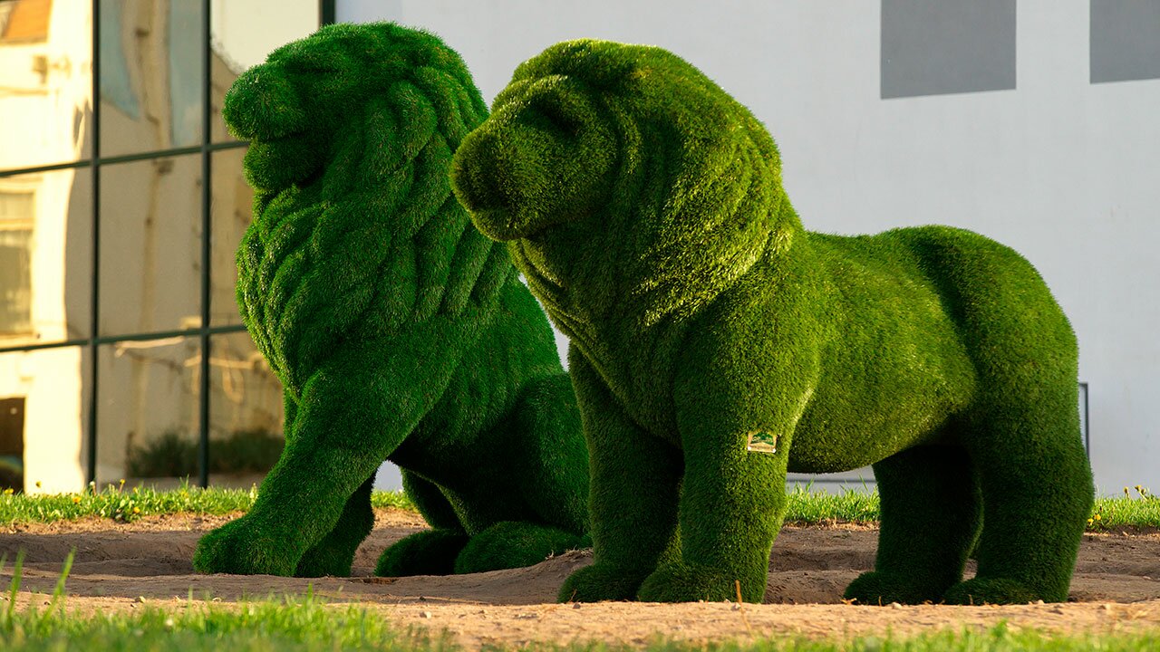 Фигуры, судя по наличию грив, представляют собой двух самцов льва: один стоящего, а другого сидящего. Издали кажется, что они созданы путем искусной стрижки кустарника, однако это только имитация — каркас животных изготовлен из металла, а сверху обтянут искусственным газоном.
