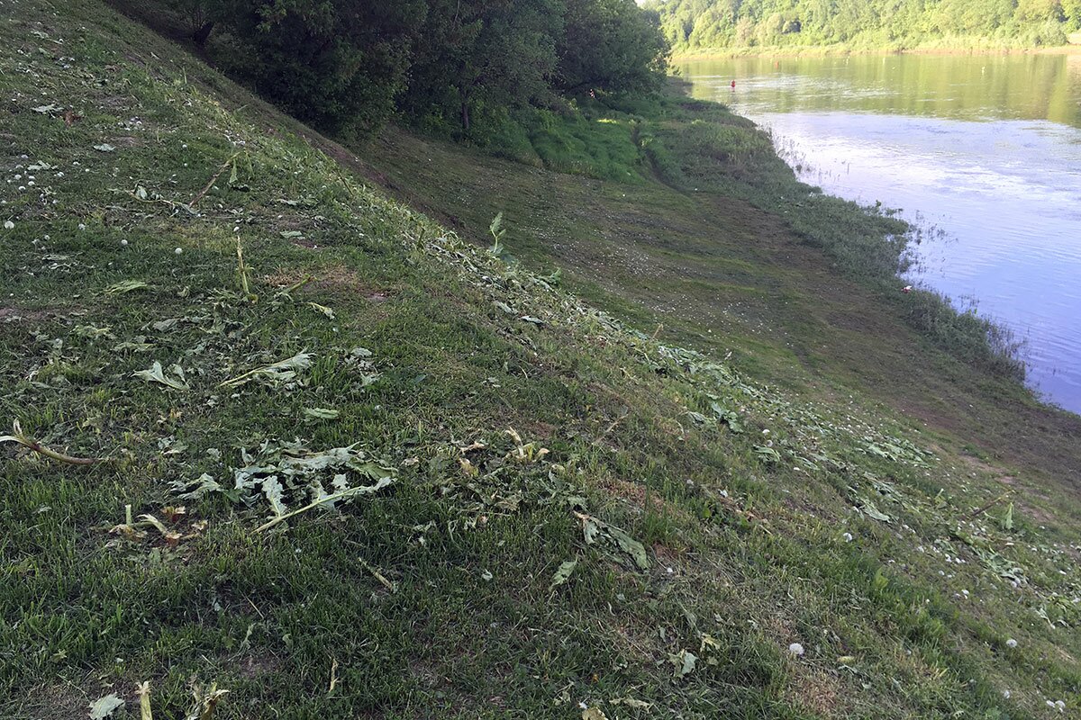 Скошенные стебли и листья борщевика оставили неубранными у спуска к реке, так что горожанам, гуляющим в этом районе с детьми, необходимо внимательно следить за тем, чтобы они не испачкались соком, который на солнечном свету вызывает ожоги.