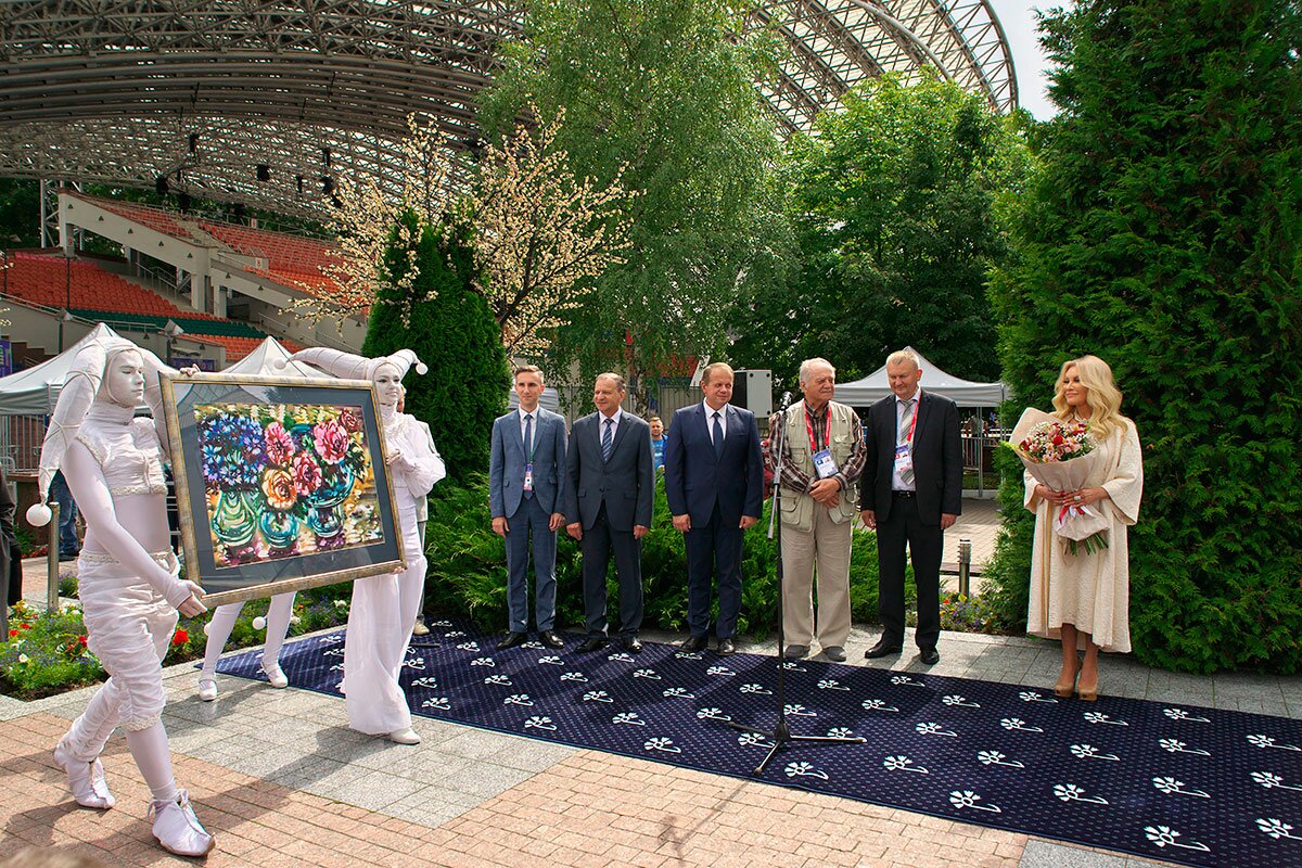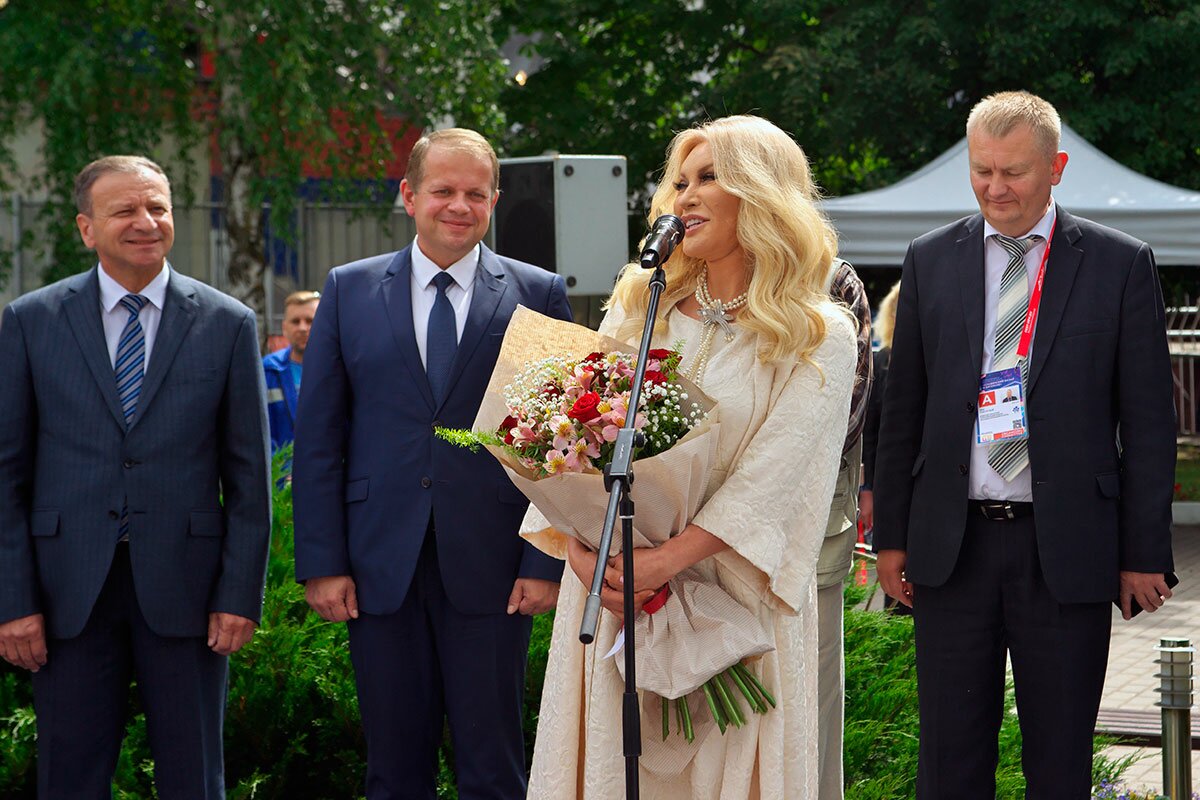 Таисия Повалий увезет из Витебска полотно известного акварелиста Феликса Гумена. Художник присутствовал при открытии именной плиты певицы на Площади лауреатов — так с 2016 года официально называется Аллея звезд у Летенго амфитеатра.