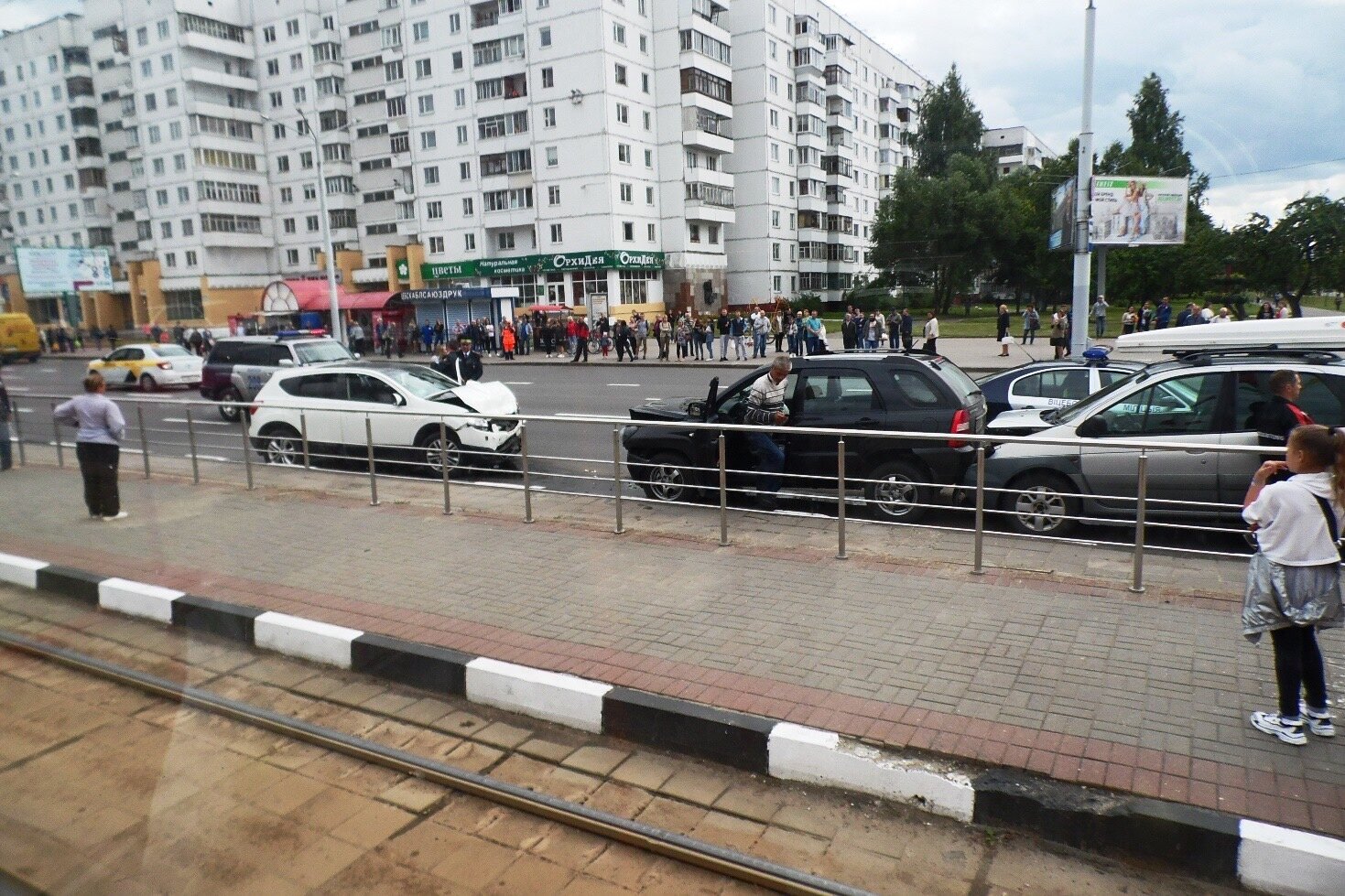 После этого дебоширка села в свой автомобиль «Nissan Qashqai» и каким-то образом выехала на противоположную от церкви сторону проспекта. Там она поехала навстречу потоку автомобилей и столкнулась сначала с микроавтобусом у поликлиники, а затем с тремя легковыми автомобилями на перекрестке с проспектом Победы.