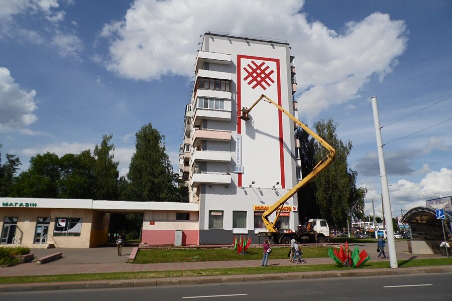 Орнамент, который часто используется в Беларуси для украшения одежды и придания ей национального колорита начали наносить на дома около двух недель назад. Сейчас заканчивают знаки красного цвета.