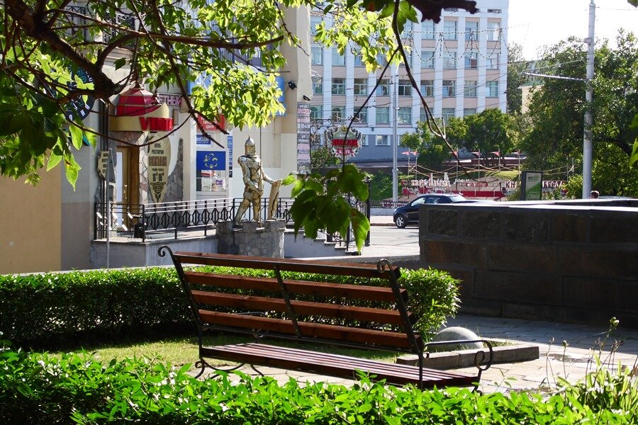 Раньше скамейки у фонтана были установлены ближе к реке — под тенистыми ветвями деревьев вдоль парапета. Одна из новых скамеек установлена также, было бы логично переставить и остальные подальше от брызг.