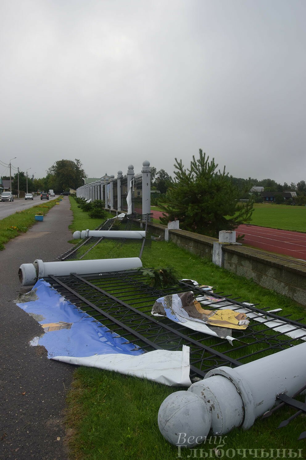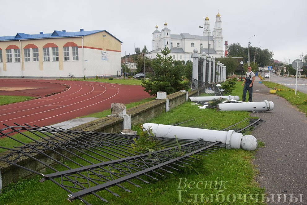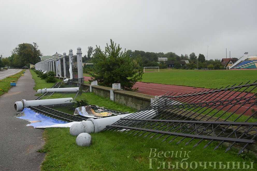 Шокирующие фото последствий стихии, обрушившейся на райцентр в ночь с 19 на 20 августа, опубликовала газета «Веснік Глыбоччыны». Судя по этим фотографиям, не менее трех бетонных столбов забора вокруг стадиона переломались как спички.