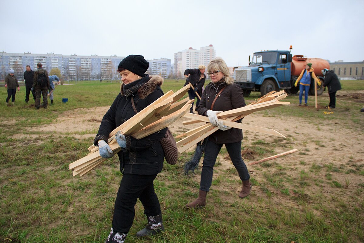 В Витебске чиновники и горожане вместе посадили деревья возле Ледового дворца. Фоторепортаж