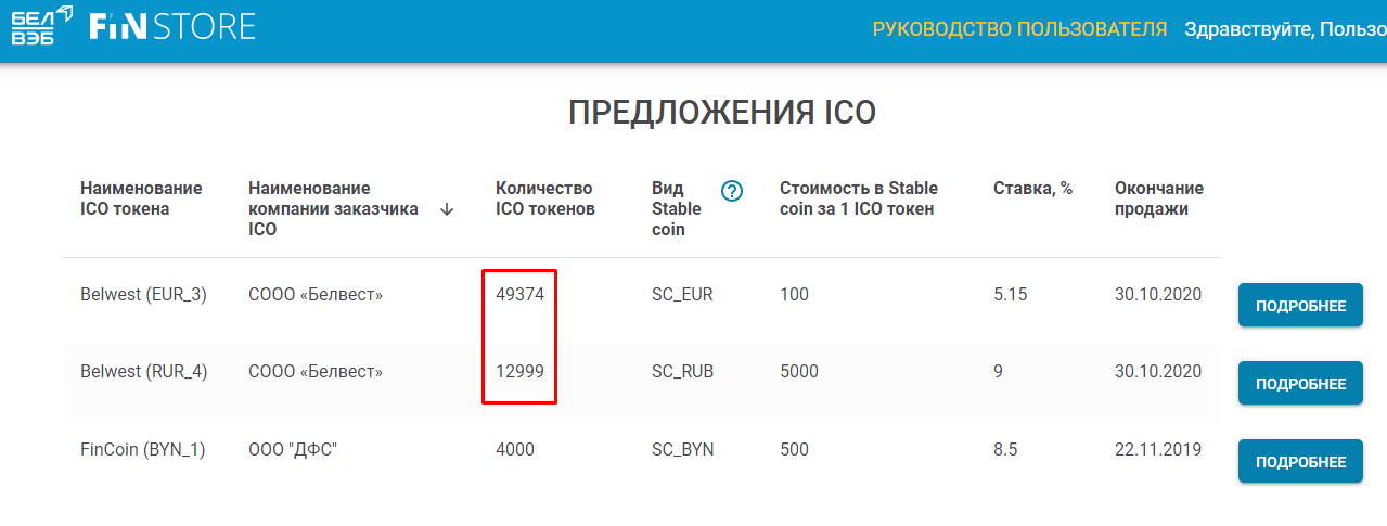 По состоянию на утро воскресенья, 3 ноября, к продаже предлагается 12 999 токенов в российских рублях и 49 374 токена в евро. Таким образом, за первые дня продано 627 токенов или чуть менее 1% от выпущенных. При этом более шестисот токенов были приобретены в первый день ICO, а в субботу, судя по сайту finstore.by совершались единичные сделки.