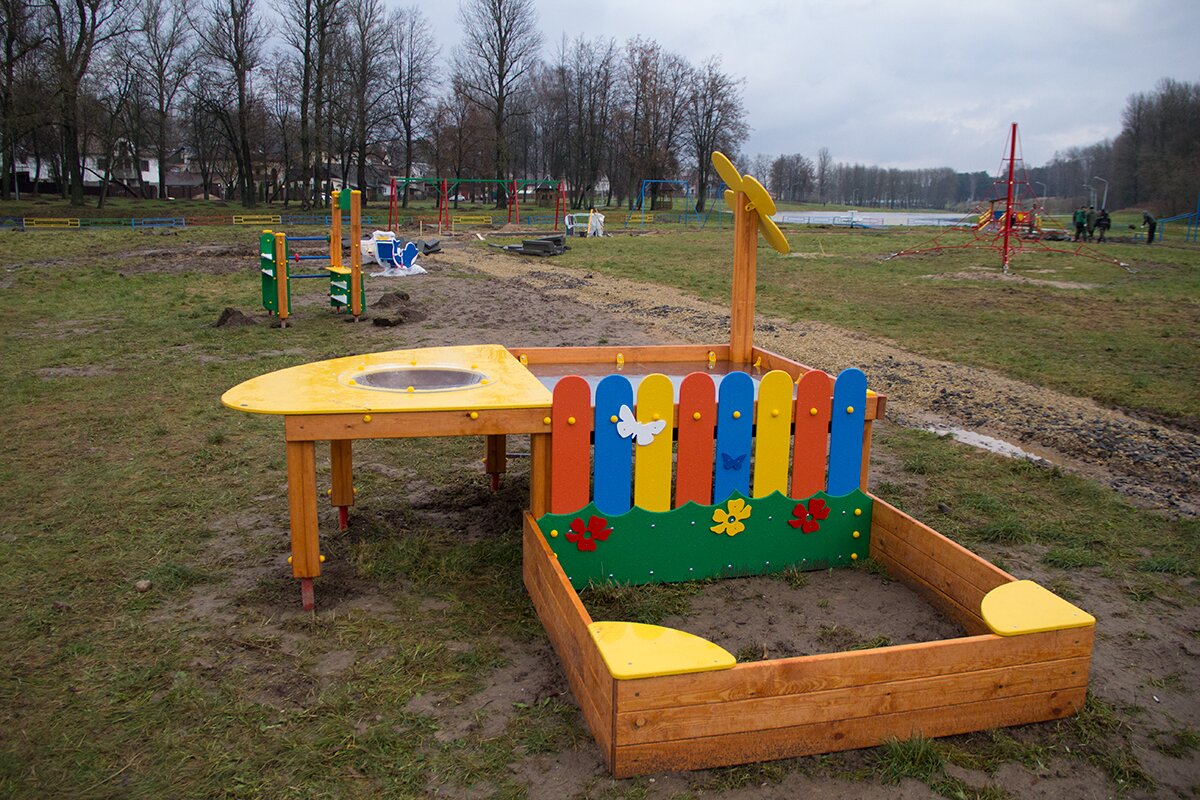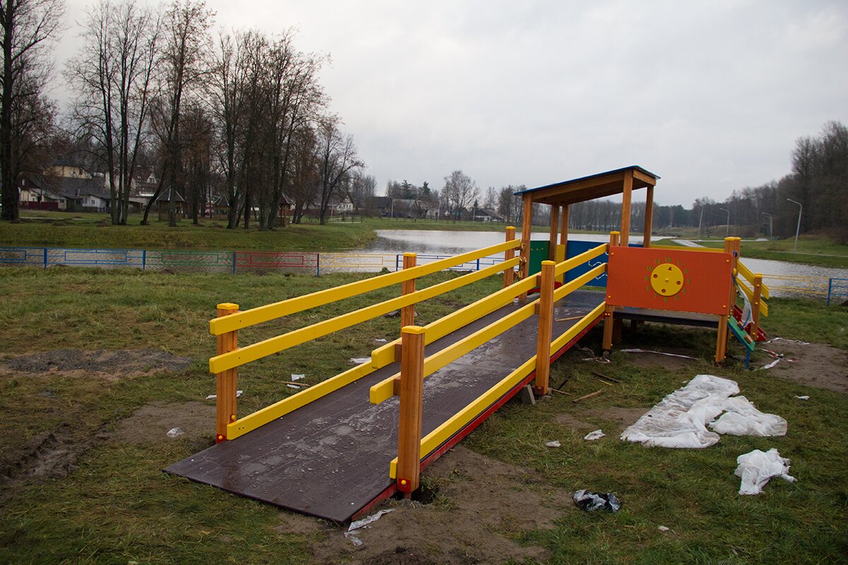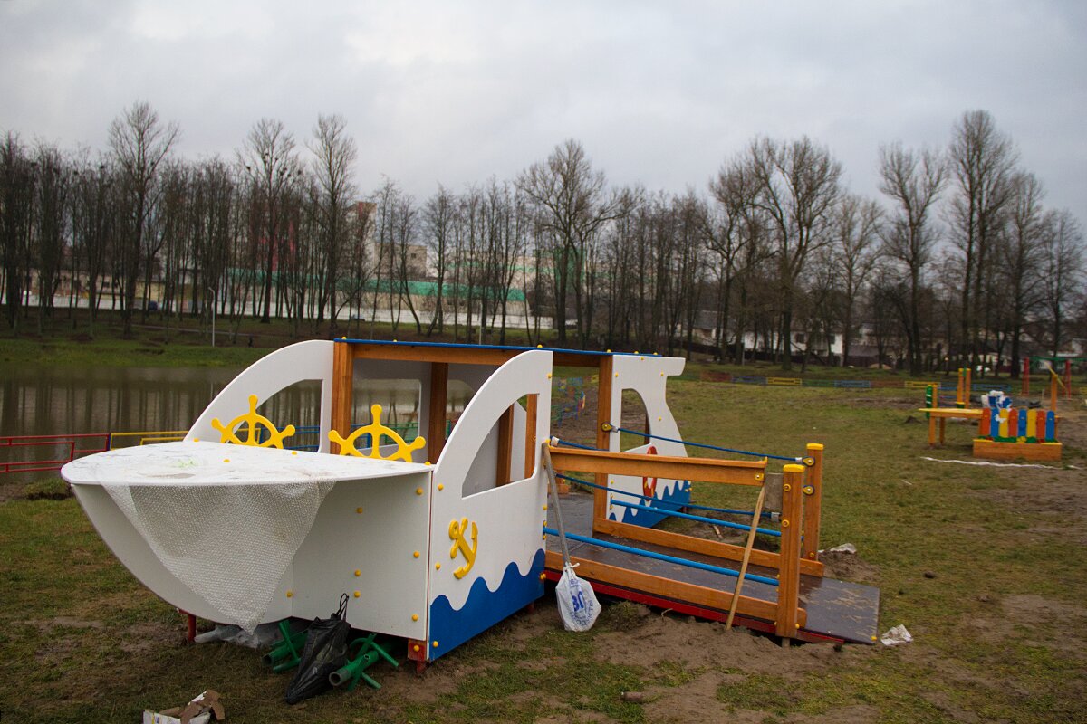 На острове в зоне отдыха на Витьбе благоустраивают детскую площадку, где смогут играть особенные дети. Здесь уже появились спортивно-игровые объекты, деревянные домик и катер.