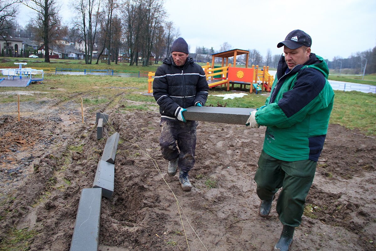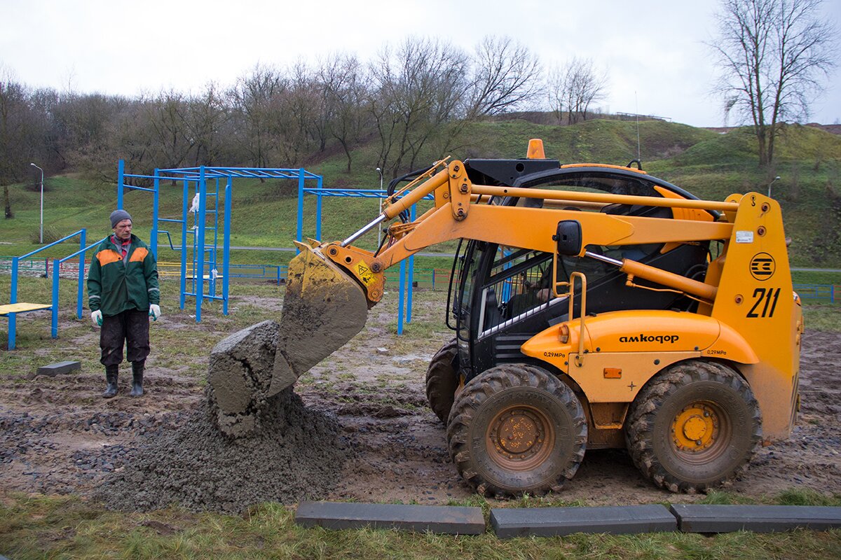 Несмотря на то, что 7 ноября - выходной, на объекте трудятся рабочие: обустраивают пешеходные дорожки, устанавливают лавочки.