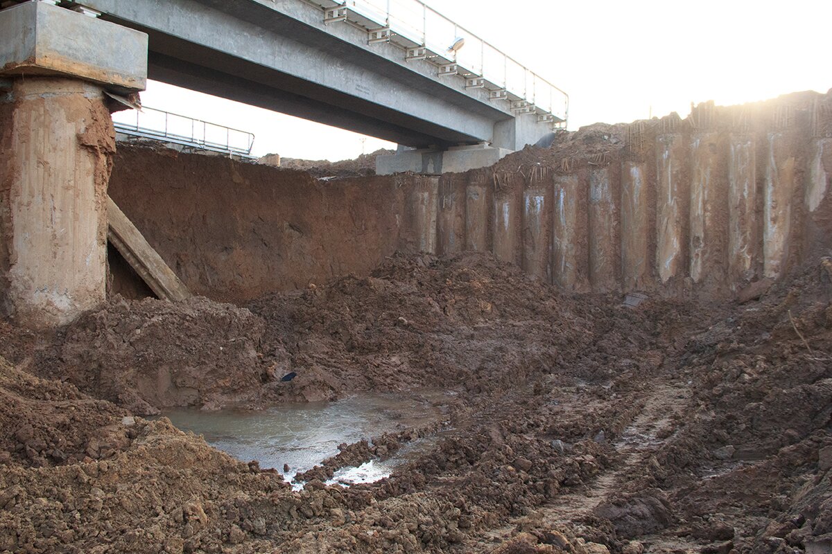 Сейчас в этом месте начали убирать грунт под железнодорожными мостами, так как магистраль будет проходить под путями. Пока прокопали один "сквозной" туннель, через который из-под моста можно увидеть жилые дома в Билево.