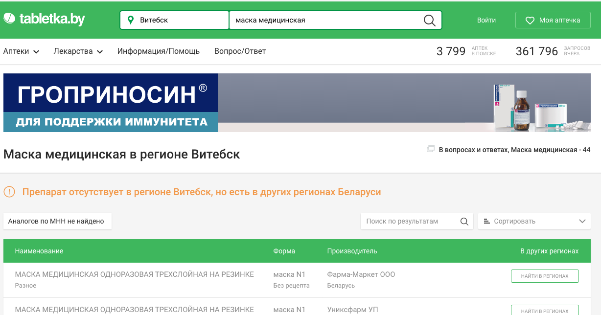 Вечером 5 марта оба сервиса поиска медикаментов по аптекам сообщили, что в Витебске медицинских масок в продаже нет.