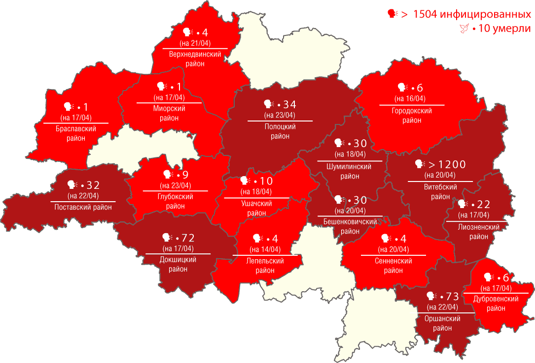 На прежнем уровне остается количество заболеваний COVID-19 в Поставском и Бешенковичском районах. В последнем, правда, продолжается рост пневмоний — на 23 апреля там было уже 67 пациентов с таким диагнозом, согласно информации райисполкома.
